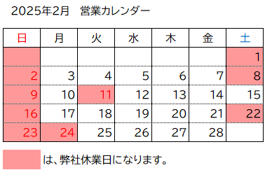 2月の弊社営業日・休業日のお知らせを致します。